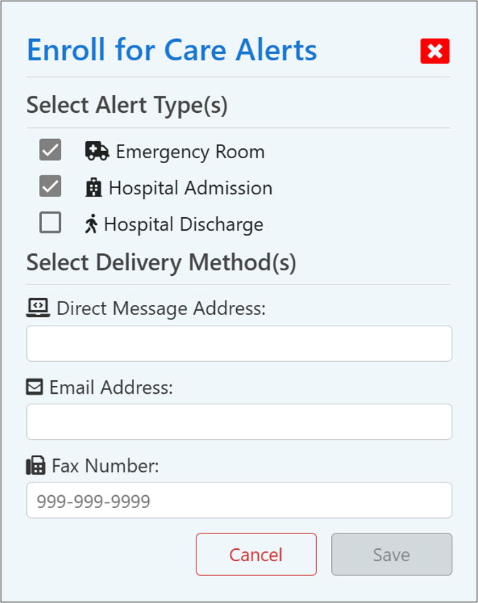 - Pick the Care Alerts types: emergency room, hospital admission and/or hospital discharge.