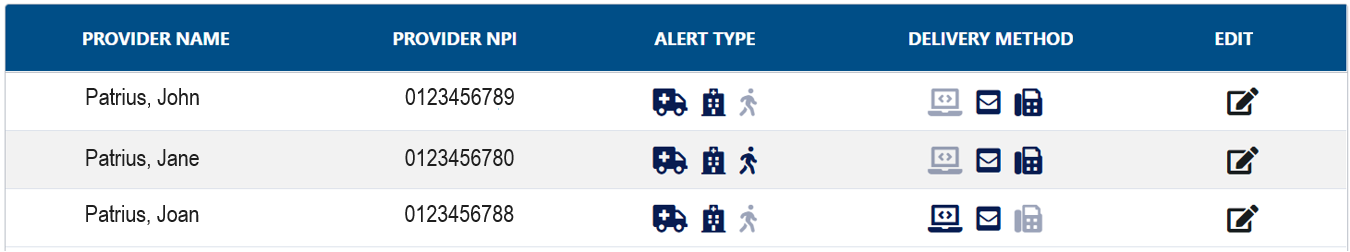 - Select a provider in the Edit column to choose the preferred Care Alerts and delivery methods (see below).